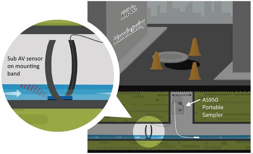 A sub AV sensor installed in a dry stormwater drainage culvert signals the sampler to take a sample during a storm and paces the sampler for flow proportional samples